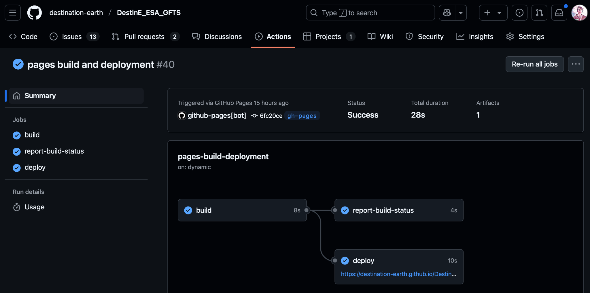 Detailed Logs: All GitHub Actions runs, including logs for linting, testing, and deployment workflows, are publicly accessible at https://github.com/destination-earth/DestinE_ESA_GFTS/actions. These logs provide detailed insights into the execution of each workflow, facilitating debugging and verification. Below is a view of the Github action tab in the Github repository showing a successful run of the deployment of the documentation.